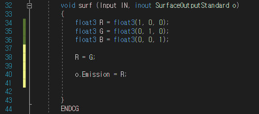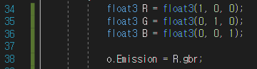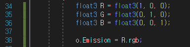 다시 색상으로 돌아와서... float3 (1, 0, 0)은 빨강, (0, 1, 0)은 초록, (0, 0, 1)은 파랑이라면?