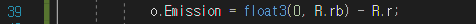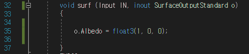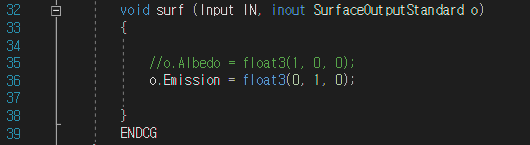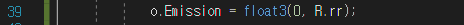 때문에 o.Emission = R; 아래에 R = G;라고 작성한다면 빨간색이 출력됩니다.