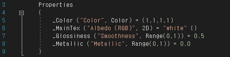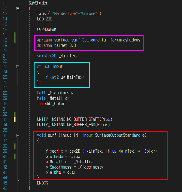 이는 지금부터 CG코드를 이용하겠다는 선언문으로 CGPROGAM부터 ENDCG라고 쓰여있는 곳까지는 CG언어로 작성된다는 것을 의미합니다.