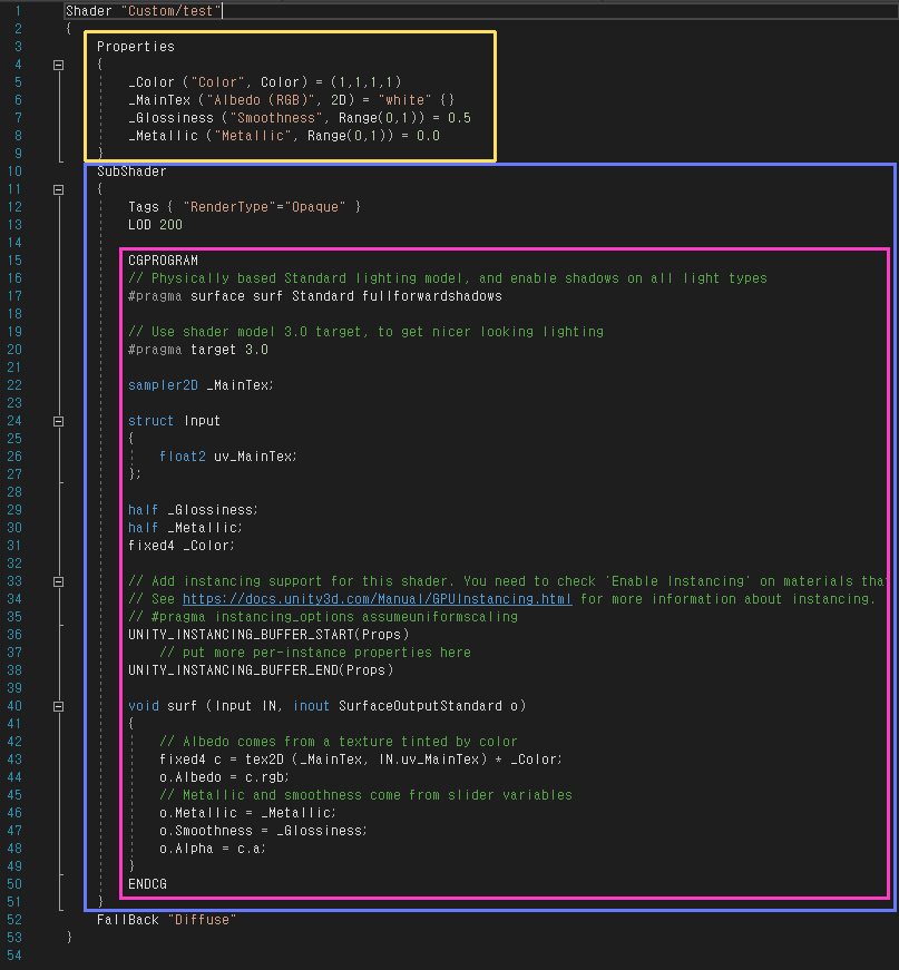 유니티 셰이더는 정통 코드가 아닌 스크립트로 이루어져 있습니다.